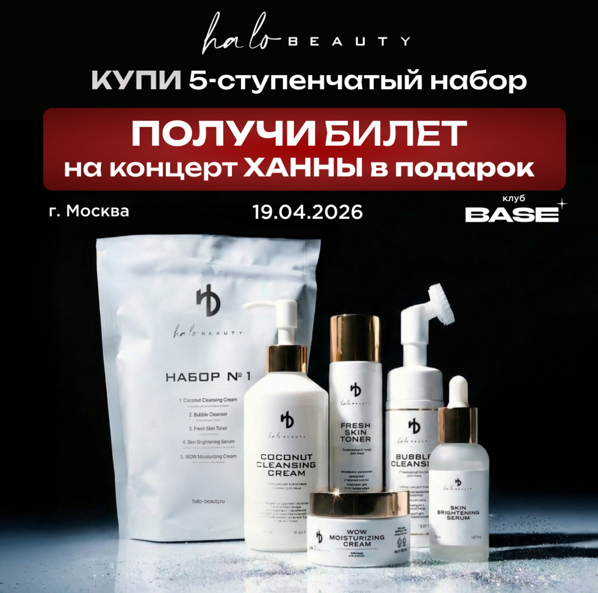 1. При покупке набора Ha Lo № 1 / набора Ha Lo № 2 на официальном сайте Ha Lo Beauty (https://halo-beauty.ru/) покупатель получает пригласительный билет на сольный концерт певицы ХАННЫ (Курьяновой А.В.), проводимый "19" апреля 2026 года по адресу: г. Москва, ул. Орджоникидзе, д. 11, стр. 1 (клуб Base). Билет (QR-код) будет направлен покупателю по электронной почте в течение 3 рабочих дней с даты покупки товара, участвующего в акции.