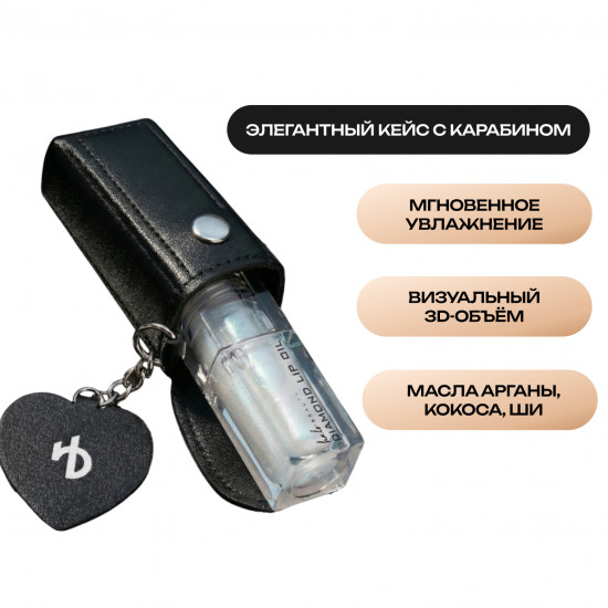 Мерцающее масло для губ увлажняет, дарит им влажный блеск и 3D-объем с невесомой текстурой. Мощный коктейль из масел арганы, ши, кокоса и витамина Е интенсивно питает и смягчает. Элегантный кейс с карабином - Must-Have аксессуар, чтобы ваш идеальный блеск был всегда под рукой. Это не просто уход для губ— это проявление вашего безупречного вкуса.