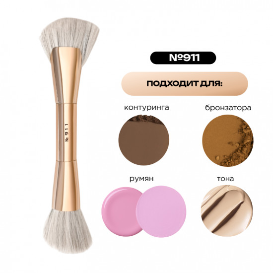 Двойная кисть для нанесения контуринга, бронзатора, румян и тона подходит для коррекции формы лица и работы с сухими и кремовыми текстурами. С помощью кисти можно подчеркнуть линии скул, подбородка, затенить зону лба и визуально изменить форму носа, а также распределить тон или нанести румяна. Удобная эргономичная ручка. Плотно набитая кисть с мягким ворсом идеально наносит и растушевывает средство без резких переходов и полос.