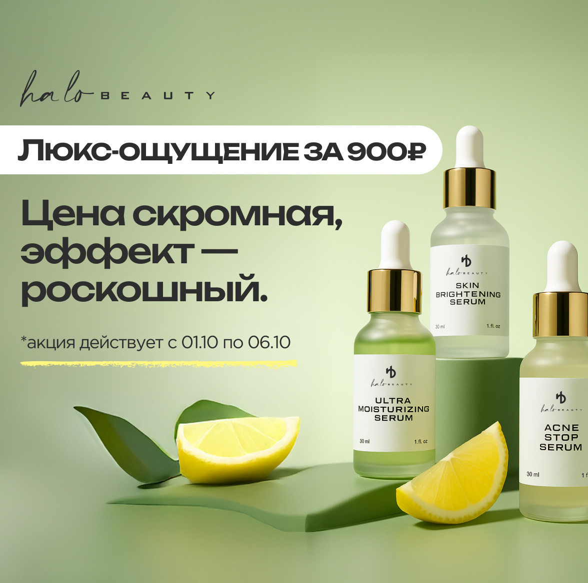 Акция проводится с 01.10.2025 до 06.10.2025 включительно при покупке товаров на официальном сайте Ha Lo Beauty (https://halo-beauty.ru/). Акция может быть отменена в любой момент по усмотрению п..